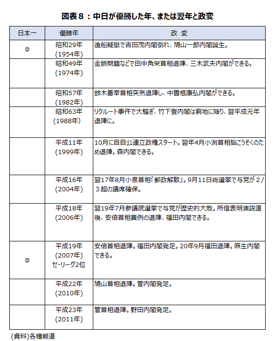 なお、中日がセリーグ優勝年9回中、その年に政権交代が起こったのが6回、翌年が3回と、政変と中日優勝は密接な関係にあるというジンクスがある(図表8)。安倍首相の突然の退陣を受け、万一、現在4位の中日の快進撃が始まった場合、日本シリーズのランキング組み合わせが微妙なことになるので要注目だ。