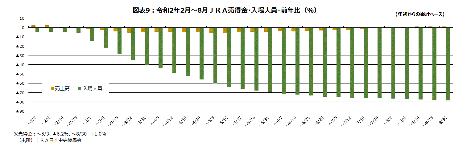 JRA(中央競馬会)の今年の売得金・年初からの累計金額の前年比は2月29日から無観客レースとなり、ネット(ごく一部が電話)でしか馬券が購入できなくなったため、5月3日の週までの累計で▲6.2%まで悪化した。しかし、そこから改善し、8月30日までの週の累計では前年比+1.0%と増加になっている(図表9)。4週連続で累計前年比プラスとなった。コロナ禍の中で無観客レースを強いられる中でも、ネット販売を中心として、しっかり売上げを増加基調に戻した。こうした、新型コロナウイルスの感染拡大防止と経済の両立が求められる局面だ。