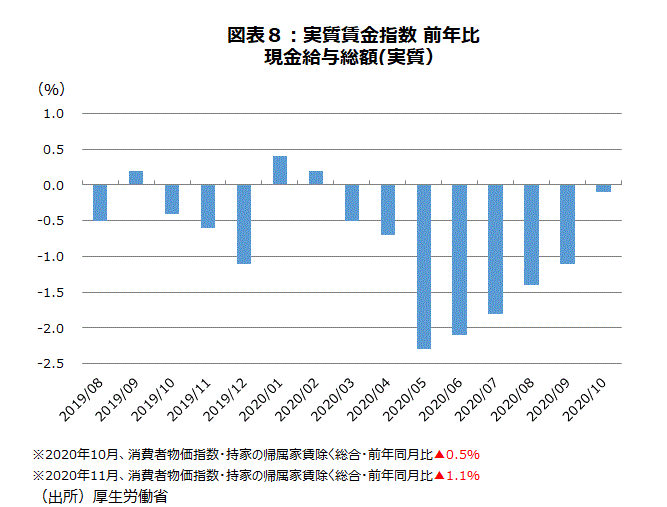 現在、物価が安定している点も大きい。短期的な物価下落なら、実質賃金の増加要因になる。11月の実質賃金は9カ月ぶりに前年同月比プラスになりそうだ(図表8)。GO TOキャンペーンによる宿泊費下落、携帯電話料金の引下げを政府が主導していることもあって、物価が上昇しそうな局面ではない。日銀は金融政策を緩和状態にしておきやすく、企業の資金繰りを支援しやすい状況だ。