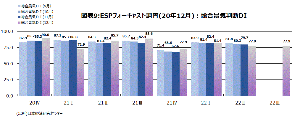 ESPフォーキャスター全員の総意を示す「総合景気判断DI」を見ると、2020年10~12月期は景気判断の分岐点にあたる50を大幅に上回る90.0。その後2022年7~9月期までは70~80台で、50を大幅に上回って推移する。「総合景気判断DI」が一時的に低めになるのは、2021年1~3月期と夏季オリンピック終了直後の2021年10~12月期だが、どちらも72.9で50をかなり、上回っている(図表9)。多少の振幅があるものの、おそらく2020年5月を谷とする緩やかな景気回復が続くというのがエコノミストのコンセンサスとなっている。