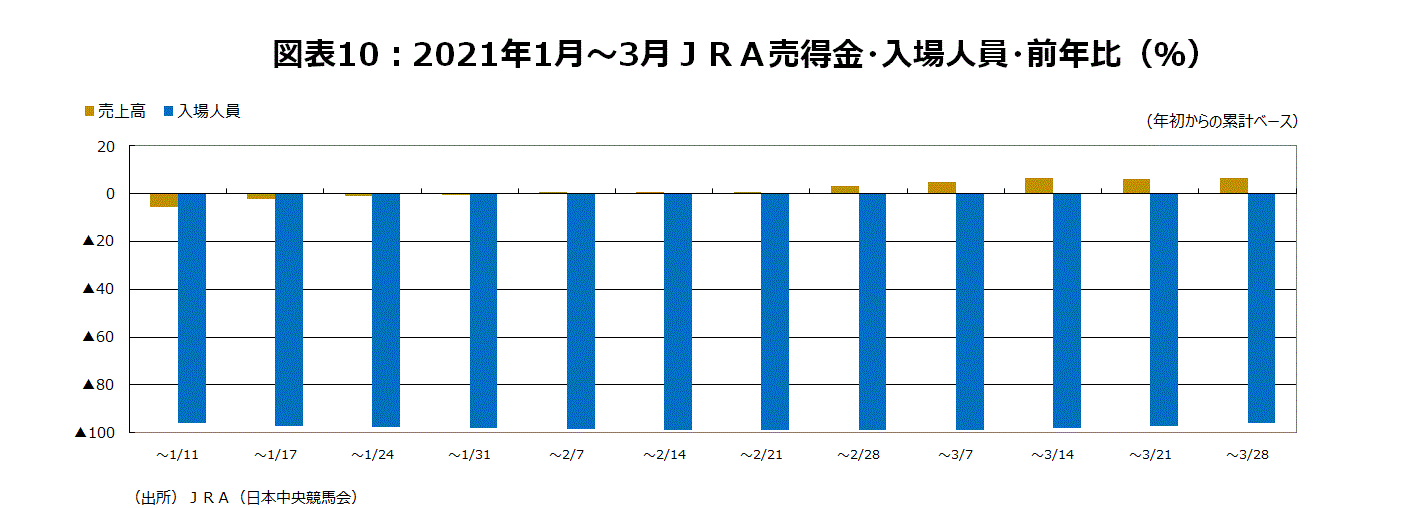 20年のJRA(日本中央競馬会)の売得金・年初からの累計金額の20年は前年比+3.5%と9年連続の増加になった。21年は2月21日現在+0.6%だったが、2月28日現在+3.5%と急に伸び率が高まった。20年が2月29日から無観客レースになった反動が出たかたちだ。20年は無観客レースになった直後は競馬場に来場する人の馬券購入がなくなり売り上げが急減したが、ネットでの馬券購入が増加し、5月初めを底に売得金・累計前年比が回復した。3月28日時点まででは+6.5%まで伸び率が高まった(図表10)。今年の売上も10年連続増加に向け、順調に推移すると思われるが、前年比を見た場合、年末に向けては伸び率がそれほど伸びない、あるいは鈍化する時期も出てくると思われる。今年はデータを見る時は、表面的な伸び率だけでなく、総合的な判断が必要だろう。