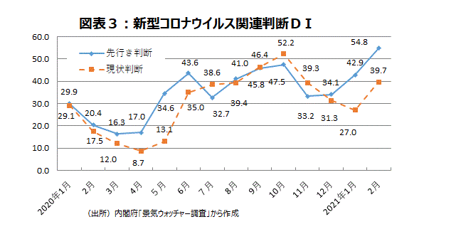 (2月の「新型コロナウイルス」関連先行き判断DI初の50超。「ワクチン」関連先行き判断DIは61.2に)