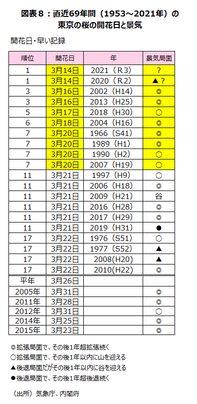 20年の東京の桜の開花日は3月14日とこれまで最も早かった3月16日より2日早く咲いた。今年も3月14日と昨年に続き観測史上最速タイになった。1953年から実施されている気象庁の生物観測調査で、東京の桜の開花が3月21日以前と早い年は一昨年までで14回あり、この時、景気は後退局面になったことがそれまではなかった(図表8)。厳しい冬の期間が過ぎて明るい気分になる人々も多いだろう。さらに、早く春が来ると春物が売れるし、お花見の宴会で人々の気分が高揚するからだ。しかし、昨年・今年と2年連続で新型コロナウイルスの感染拡大を予防するために、お花見の宴会が自粛された。2月の景気ウォッチャーで、先行き判断で「桜」についてコメントした人はいなかったが、「花見」についてコメントした人は6人と少ないながらいた。「花見」関連DIをつくると75.0と高水準だ。淡いピンク色の桜の花を見ることは、宴会は出来ずとも人々のマインドを明るくさせる効果がありそうだ。