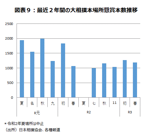 大相撲の懸賞は今年の初場所は1,270本とコロナ禍で最高を記録した。しかし、コロナの影響がほとんどなかった20年1月との比較である前年同場所比は▲30.8%の大幅減だった。今年3月の春場所は通常の大阪開催でなく、両国国技館で開催された。事前申し込みは1,366本だったが、最終的には15日間で1,191本となった。コロナ禍では2番目に多い本数になった。前年春場所比は+11.5%の増加である。それなりの底堅さが感じられる数字と思われる(図表9)。