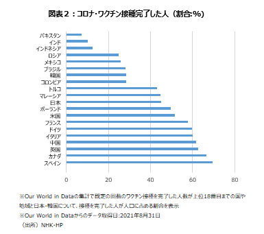 新型コロナの変異ウイルスが猛威を振るっていて予断を許さない状況ではあるが、希望はワクチンである。直近、7月の景気ウォッチャー調査で、ワクチン関連先行き判断DIをつくると57.0と、景気判断の分岐点50を大きく上回る。人々のワクチンへの期待感が大きいことがわかる。ワクチン接種が完了した割合が8月31日時点で45.00%になった(図表2、NHKのHPによる)。半月前の8月15日時点では36.70%だった。半月で8.30ポイント増加した。このペースが維持されるとすると、10月末には78%程度という数字が期待される。現在G7で一番割合が大きい国はカナダ(66.41%)だが、直近半月での増加テンポ2.99ポイントで増加するとみると、10月末には78%で並ぶ計算になる。新型コロナウイルスの集団免疫に関してはまだ確たることはわかってないようだが、7~8割の人がワクチン接種完了といった状況になれば、新型コロナウイルスの感染状況に明るい変化が生じることを期待したい。