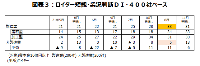 8月ロイター短観は、製造業・業況判断DIが前月から8ポイント改善し+33となり、18年1月(+35)以来の水準に回復した。半導体需要の高まりで化学製品が過去最高を更新した。一方、非製造業DIは+5と前月から8ポイント改善し20年2月(+15)以来の水準になり2カ月ぶりにプラスに転じた(図表3)。新型コロナウイルスの感染拡大という厳しい環境下であるが、東京オリンピック関連商品の販売が伸びた企業もみられたという。