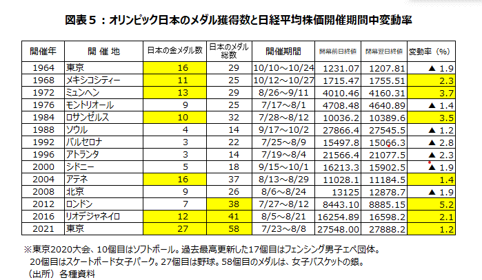 日本の金メダル数が2ケタに達した大会は、1968年メキシコ大会以降全て、日経平均株価が大会期間中に上昇した。2ケタになった今回の東京大会は1.2%と低めの上昇率だが大会期間中の日経平均株価上昇は維持された。ちなみに10個に到達しなかった大会は、2012年のロンドン大会を除いて全て大会期間中に下落している。ロンドン大会の金メダルは7個と少なかったが、銀・銅を含めたメダル数が38と当時で史上最多となりマインドに大きくプラスに働いた。金メダル10個が大会期間中の日経平均株価が上昇するか下落するかの閾値と言えよう(図表5)。