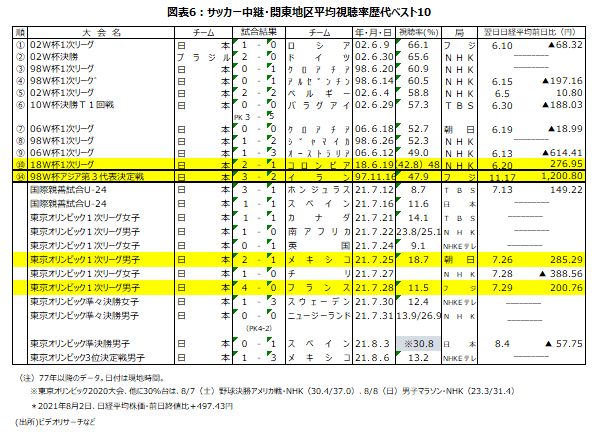 今回のオリンピック競技の中でも視聴率から見て人々の注目度が高かった、サッカー男子日本代表の試合結果と日経平均株価との間の関係も興味深いものがある。日本代表と翌営業日の日経平均の関係は、これまでのワールドカップなどの結果からも明白だ。例えば、ワールドカップ初出場を決めたジョホールバルの歓喜と言われる1997年11月のイラン戦は視聴率が翌日の日経平均株価が北海道拓殖銀行の経営破綻のニュースにもかかわらず1,200円高の上昇となったことは有名だ。