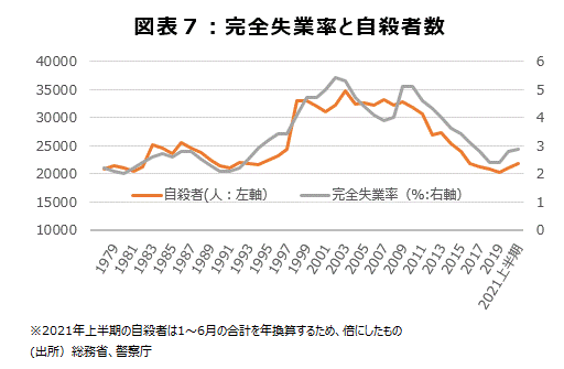 7月の雇用統計の改善は、7月の自殺者が13カ月ぶり前年比減少と改善したことと一致する。警察庁「自殺統計」の自殺者数と完全失業率の年次データの相関係数は0.911と強い相関がある。新型コロナウイルス感染拡大により2020年の自殺者数は2万1,081人、前年比は+4.5%の増加。完全失業率と同様に11年ぶりに悪化に転じた(図表7)。2021年上半期の1カ月平均は1,820人だった。前年同期の2020年上半期の同1,596人に比べて14.0%の増加であったが、前期の2020年下半期の同1,917人に比べ▲5.1%と減少になっている。完全失業率と同様の動きである。