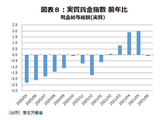毎月勤労統計の実質賃金の最新データである6月分の前年同月比は▲0.1%で5カ月ぶりの減少になった(図表8)。この統計は2015年=100とした統計で、実質化の時に全国消費者物価指数・持家の帰属家賃を除く総合2015年基準をデフレーターとして使っている。2020年=100とした統計では、2020年基準をデフレーターとて使うので、来年になれば、20年6月分の実質賃金の前年同月比はプラスであったということになろう。