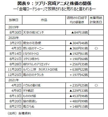 日本テレビ「金曜ロードショー」でジブリ作品または宮崎駿監督の作品が放映されると、翌週初の営業日の株価が大きく変動するという、いわゆる「ジブリの法則」が10年ほど前に話題になった。米国の雇用統計の発表が原則第1金曜日であることなどが要因と思われる。今年8月にもいつものようにジブリ作品が「もののけ姫」「猫の恩返し」「風立ちぬ」と3週連続で放映されたが、次の月曜日の前日差は全て3ケタになった。今年の8月の21営業日中、前日差が3ケタだったのは13営業日、1ケタあるいは2ケタだったのは8営業日であった。ジブリ作品が放映されて2ケタの変動になったのは2019年8月30日「天空の城ラピュタ」が最後で、以後2年間は全て3ケタの変動である。「ジブリの法則」は近年も生きていることが、確認できた(図表9)。