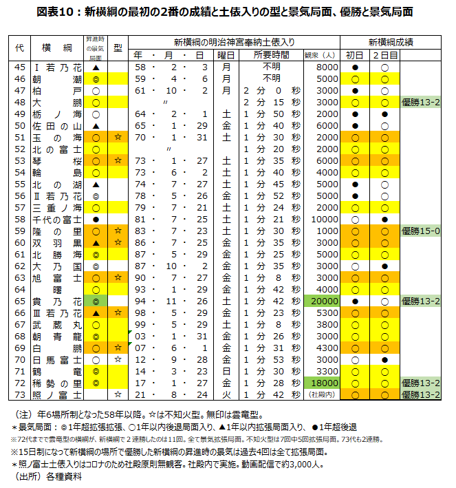令和3年秋場所では、2人の横綱のうち白鵬が、部屋の力士に新型コロナ感染者が出たため所属する宮城野部屋の他の力士とともに休場した。白鵬は秋場所終了後に引退し、年寄「間垣」を襲名した。もう一人の横綱・照ノ富士は初日から優勝争いの先頭を走り、13勝2敗で優勝した。怪我・病気で大関の地位から陥落し、一時は序二段まで番付を下げたがそこから復活し、新横綱として優勝した。15日制になって新横綱での優勝は、これまでは昭和36年九州場所の第48代横綱・大鵬(13勝2敗)、昭和58年秋場所の第59代横綱・隆の里(全勝)、平成7年初場所の第65代横綱・貴乃花(13勝2敗)、平成29年春場所の第72代横綱・稀勢の里(13勝2敗)の4人で、優勝した場所の景気局面は全て拡張局面であった。重圧を撥ね退け優勝を果たした新横綱から勇気をもらった人も多いだろう。第73代横綱・照ノ富士は令和初の横綱として新横綱の場所で5人目の優勝者となった。景気も拡張局面であることが期待される(図表10)。
