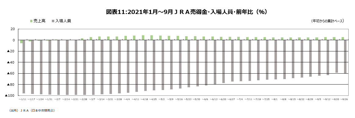 コロナ禍でも順調に推移している身近なデータは多い。例えば、競馬売上高が挙げられる。20年のJRA(日本中央競馬会)の売得金は前年比+3.5%と9年連続の増加になった。20年は無観客レースになったことで一時落ち込んだが、ネットでの馬券購入が増加し持ち直した。21年は9月26日時点までの年初からの累計前年比は+5.1%の増加になっている(図表11)。10年連続上昇に向けて順調に推移していると言える。