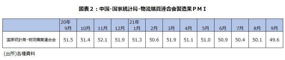 国家統計局の中国製造業PMI21年9月は49.6だった。前月の50.1から0.5ポイント低下し、景気判断の分岐点である50を20年2月以来、1年7カ月ぶりに下回った(図表2)。電力不足の他に、国際物流の停滞や半導体不足の影響もみられよう。