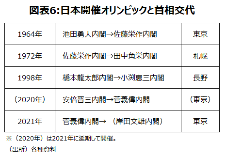 菅首相は9月3日に自民党総裁選不出馬を表明した。菅義偉首相の後継を選ぶ自民党総裁選は29日に投開票され、決選投票の結果、岸田文雄前政調会長が河野太郎規制改革担当相を破り第27代総裁に選出された。岸田氏は10月4日召集の臨時国会の冒頭、第100代首相に指名される見通しだ。日本で五輪開催年には総理大臣が交替するというジンクスは、東京2020大会の開催年2021年でも生きていた(図表6)。