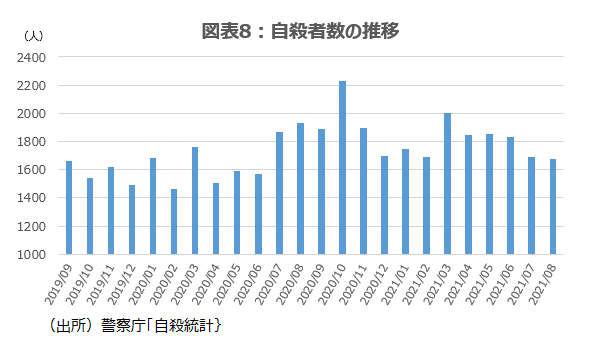 完全失業率と強い相関があるのが、自殺者数だ。完全失業率と警察庁の自殺者数の年次データの相関係数は、データが存在する最長期間(1978年~2020年)で0.911だ。7月の自殺者数は1,687人にとどまり前年同月比▲9.5%の減少となった(図表8)。強い相関係数からみて、7月の自殺者数が13カ月ぶりに前年比減少と改善したことは7月の雇用統計の改善と整合的だと言えそうだ。自殺の理由は、健康問題、家庭問題など様々だが、経済生活問題が理由となることも多い。