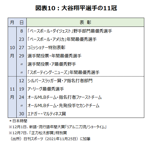 2021年で多かったのは、「東京オリンピック・パラリンピック」関連語が9語で全体の30%だった。なお、年間大賞には、ア・リーグ最優秀選手(MVP)など11冠を獲得(図表10)するほど大活躍した「大谷翔平選手」関連語の「リアル二刀流/ショータイム」が選ばれた。新語・流行語大賞も、『今年の漢字』と同様に、昨年の感染症関連語から、今年は前向きな言葉に変わり、景気が回復基調にあることを示唆している。