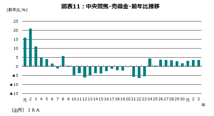 コロナ禍でも順調に推移している身近なデータが多い。競馬売上高の足元のデータを確認しよう。JRA(日本中央競馬会)の12月26日の有馬記念の売得金が前年比+5.8%となったのをはじめとして12月のG1レースは5レースが前年比増加となった。昨年が有馬記念直前の土曜日開催だったホープフルSが、今年は12月28日(火曜日)に開催され前年比+86%の大幅増加となった。21年のJRA売得金は前年比+3.6%と昨年の+3.5%を上回る増加率になり、10年連続の増加になった(図表11)。