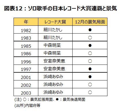 2021年の日本レコード大賞には、10組の優秀作品の中から5人組ダンス&ボーカルグループDa-iCEの「CITRUS」が選ばれた。事前には、昨年「炎」で大賞を受賞したLiSAが「明け星」で、ソロ歌手として5人目の連覇を果たすかどうか注目されていたが、大賞は逃した。これまでに連覇を達成したソロ歌手は、細川たかし、中森明菜、安室奈美恵、浜崎あゆみの4人だが、最初の受賞年と2回目の受賞年では、全て景気の局面が交替したというジンクスがある。2020年は5月を景気の谷とする拡張局面であった。このため、5人目の連覇ソロ歌手が出なかったことは、昨年末は景気後退局面になっていないことを示唆すると言えよう(図表12)。