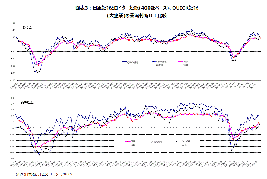 一方、大企業・非製造業・業況判断DIは+9と前回から7ポイント上昇、コロナ前の19年12月の+20以来の水準になった(図表3)。全規模・全産業・業況判断DIは+2と前回▲2のマイナスからプラスに転じ、緩やかな回復基調継続を示唆する内容になっている。