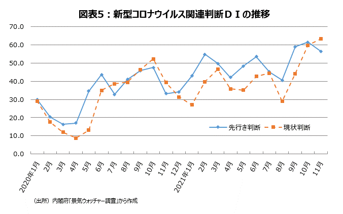 「景気ウォッチャー調査」では「新型コロナウイルス」という言葉が2020年1月調査で初めて登場した。それ以降、新型コロナウイルスの感染拡大の影響が景況感の大きなマイナス材料となっていたが、最近ではプラス要因として働くようになった。11月調査で新型コロナウイルスに触れたコメントから関連現状判断DIを作成すると63.3と20年1月以降最高となった。新型コロナウイルス関連先行き判断DIの方は10月に61.4と最高水準を更新したあと、11月は56.5へとやや低下した(図表5)。