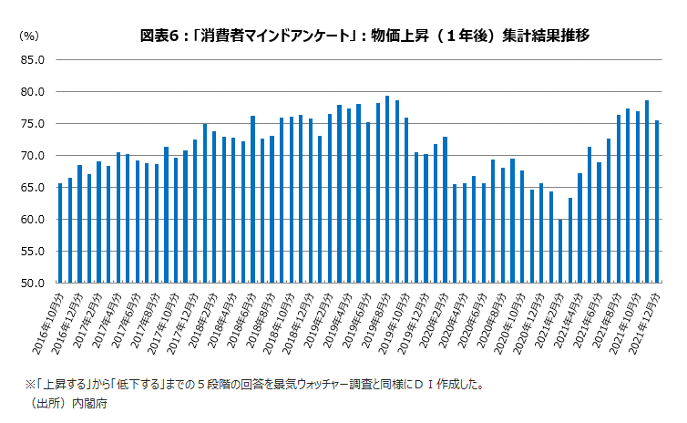 消費者マインドアンケート調査で物価上昇(1年後)の5段階の判断から景気ウォッチャー調査と同様の手法でDIを算出すると、12月は75.4で、11月の78.6から低下、21年7月(72.6)の水準に戻った(図表6)。また、12月のESPフォーキャスト調査で消費者物価指数(生鮮食品除く総合)の予測平均値の先行き推移をみると、21年7~9月期の0.0%(実績)から、10~12月期に+0.38%に上昇する。22年1〜3月期に一旦+0.23%にやや低下するが、携帯電話のマイナス寄与度が一巡し剥落する4〜6月期に再び0.87%まで上昇、ここをピークとして、以降0.7%程度で推移する見立てである。市井の人々とエコノミストのどちらも、どんどんインフレが進むとはみていないことがわかる。