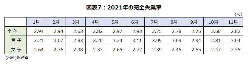 完全失業率は2021年1月~11月までの平均で2.8%(2.82%)である。2021年平均では2.8%と2020年と同じになりそうである。この期間で最も高かった月は5月の3.0%で一番低いのは3月の2.6%である。小数点第2位まででみると、5月は2.97%、3月は2.63%であった。10月は2.7%(2.68%)だったが、11月は新たな職を探しに動いた人が多く2.8%(2.82%)と若干上昇した(図表7)。