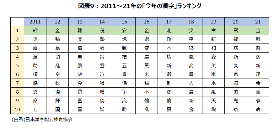 12月13日に清水寺で、2021年『今年の漢字』は『金』だと発表された(図表9)。オリンピック・パラリンピックで日本選手が活躍し多くの金メダルを獲得したことや、大谷翔平選手がメジャーリーグを舞台にベーブ・ルース以来のリアル二刀流での大活躍でMVP獲得という金字塔を打ち立てたことなどが選ばれた理由だそうだ。