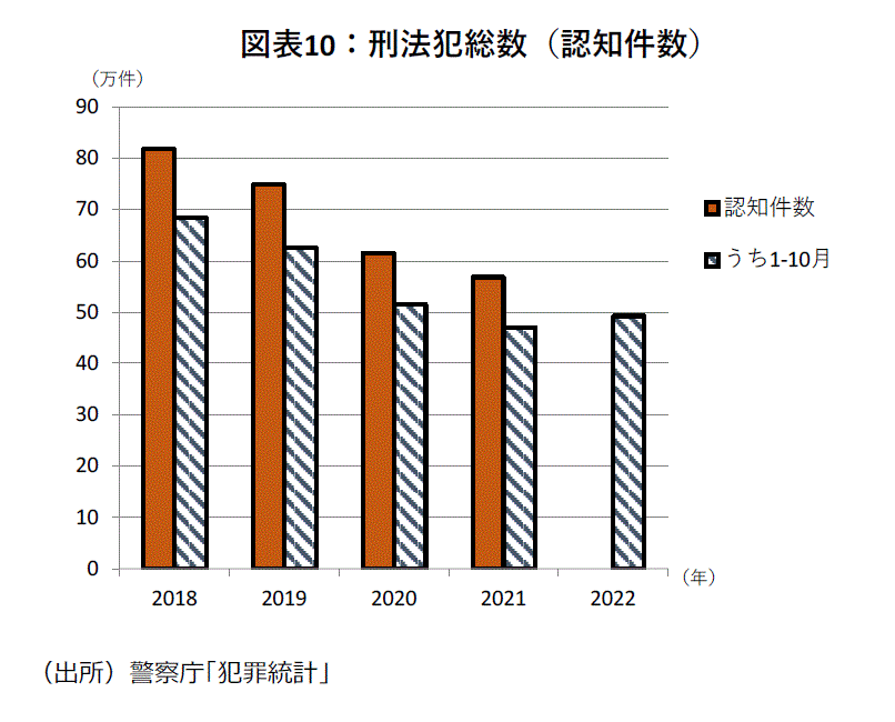 最近の身近なデータは、明暗分かれている。犯罪統計などでは、悪化傾向がみられる。9月の実質賃金が前年同月比▲1.3%と5カ月連続減少となった。デフレーターの全国消費者物価指数・帰属家賃を除く総合の前年同月比が+3.5%と高かったため、名目賃金が+2.2%増でも+3.5%で割り引いたためだ。さらに10月のデフレーターが+4.4%であることから10月実質賃金も減少が予想され、人々の生活への不安感などが強まっている。こうしたことが犯罪統計などの悪化傾向の背景とみられる。金融機関の店舗強盗事件は19年13件、20年11件、21年9件と近年は減少が続いてきた。しかし、22年は1~9月で14件となり、早くも15年以来7年ぶりの前年比増加が確定している。但し、直近の8月・9月はゼロ件と明るい数字である。また、刑法犯総数の認知件数は近年減少傾向で、昨年は56.8万件と前年比▲7.5%の減少だった。しかし、22年1~10月の前年比は+4.8%で、10月単月だと+17.6%と足元は増加傾向に変わった(図表10)。