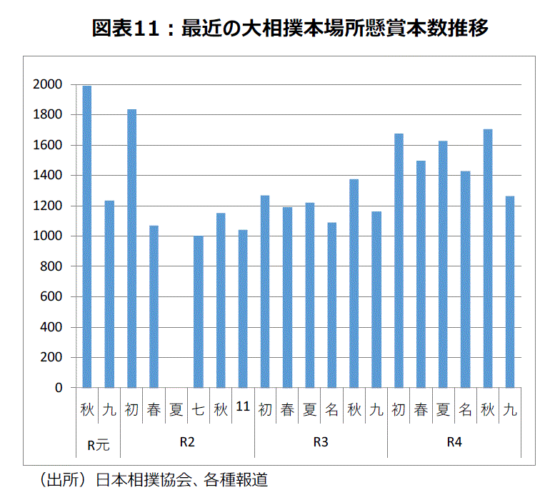 厳しい環境下でも景気拡張局面が継続していることを示唆する身近なデータも多い。まず、大相撲九州場所の懸賞本数は1,264本、前年同場所比+8.5%と9場所連続で増加となった。コロナ禍前の令和元年(19年)初場所の1,234本を+2.3%上回る水準まで戻った(図表11)。企業の業績・広告費の底堅さが感じられる数字と言えよう。令和5年初場所は、横綱が休場している照ノ富士1人・大関が貴景勝1人という異例の番付になるが、これは、横綱が小錦1人・大関が鳳凰1人だった明治31年(1898年)春場所以来125年ぶりのことになる。明治31年の景気は3月を山にして明治32年2月の谷まで後退局面になったという分析もある。初場所の懸賞本数が芳しくなくなるのではないかという見方もあろう。但し、九州場所では、懸賞獲得本数が1位の262本と人気のある大関の貴景勝が、優勝した阿炎と、髙安と12勝3敗で並び優勝決定巴戦をおこなった。初場所で貴景勝が「相当、良い成績で優勝するようなこと」になれば横綱昇進を考慮するということが11月28日の横綱審議委員会で議論された。初場所の懸賞本数も10場所連続前年同場所を上回り、コロナ禍前の水準に戻ることを期待したい。