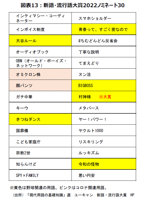 今年話題になった言葉に贈られる「ユーキャン新語・流行語大賞」が12月1日に発表され、2022年の年間大賞に、史上最年少で三冠王となったプロ野球ヤクルトの村上宗隆選手をたたえる呼び方の「村神様」が選ばれた。今年はノミネート30の中で、野球用語が6つになり、コロナ関連語が2つになった。コロナ関連語は、20年では半分の15で大賞が「3密」、21年は6つあった。今年は通常の状態に戻り、大賞も野球用語からとなった(図表13)。サッカー日本代表の長友選手の「ブラボー」は残念ながら今年のノミネートに間に合わなかった。