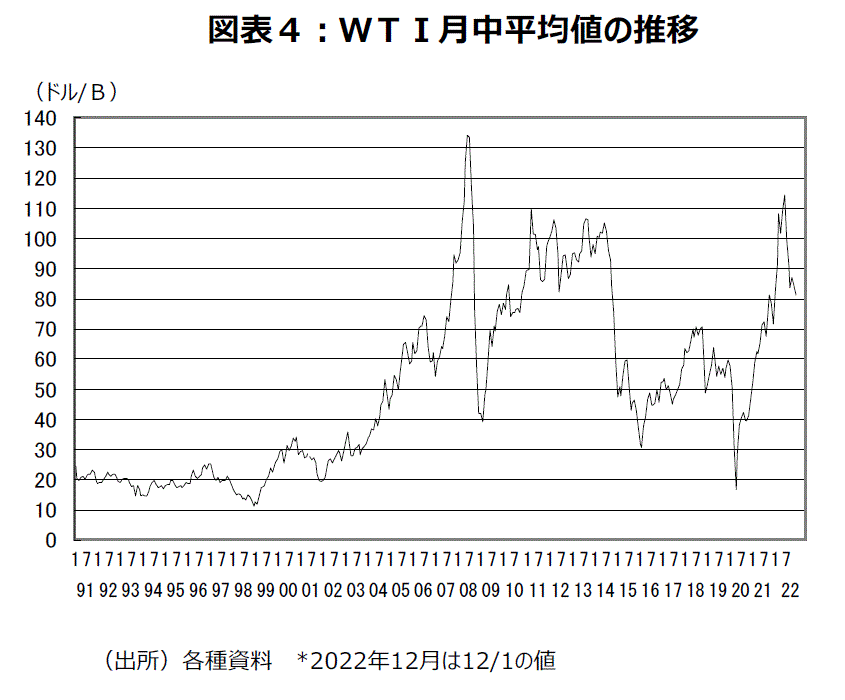 原油価格をWTI月中平均でみると、22年は2月下旬からのロシアによるウクライナ侵攻による上昇で6月に1バレル=114.34ドルとピークをつけたが、9月には83.80ドルまで低下した。しかし、10月5日のOPECプラス閣僚級会合では世界的な景気後退が懸念される中での原油価格下落を防ぐため11月から日量200万バレルの大幅減産実施で合意した。WTIは買い進まれ、10月7日終値で1バレル=92.64ドルになったが、10月月間では87.03ドルにとどまった。一時11月4日終値で90.61ドルまで戻したが高値更新はできず、下旬はかなりの時間70ドル台後半で推移したことで、11月月間では84.39ドル、12月1日終値81.22ドルにとどまった(図表4)。
