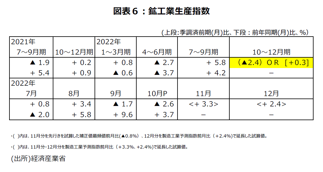 鉱工業生産指数・10月速報値・前月比は▲2.6%と2カ月連続低下した。これまでの上昇の反動に加えて、海外需要の減少等を受けて、生産用機械工業や電子部品・デバイス工業などが低下したが影響したようだ。但し、前年同月比は+3.7%で3カ月連続の上昇である。10月鉱工業生産指数では、全体15業種のうち挽回生産がみられる自動車工業など7業種が前月比上昇し、生産用機械工業や電子部品・デバイス工業など8業種が前月比低下した。経済産業省の基調判断は22年8月・9月の「生産は緩やかな持ち直しの動き」から10月では「生産は緩やかに持ち直しているものの、一部に弱さがみられる」に下方修正された。生産は均してみると緩やかに持ち直しているものの、電子部品・デバイス工業など一部に弱さがみられる状況だというのが、経済産業省の基調判断だ。製造工業予測指数や経済産業省の機械的な補正値からみると、生産指数10~12月期の前期比は、現状では低下の可能性のほうが大きそうだが、上昇になる可能性もあると言えよう(図表6)。