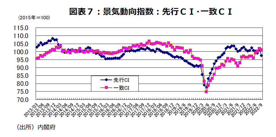 10月の「景気ウォッチャー調査」の現状判断DI(季節調整値)は前月差1.5ポイント上昇し49.9になったが、景気判断の分岐点50を上回っていた6月の52.9にはまだ届かなかった。新型コロナウイルス第7波の影響を大きく受けた、飲食関連現状判断DIは、6月から31.2ポイント大幅悪化した7月の30.8、8月は37.1の30台の厳しい数字から、9月56.7、10月61.0に大幅改善した。内閣府の基調判断は7月・8月の「持ち直しに足踏みがみられる」から、9月では「持ち直しの動きがみられる」に上方修正、10月も判断継続となっている。