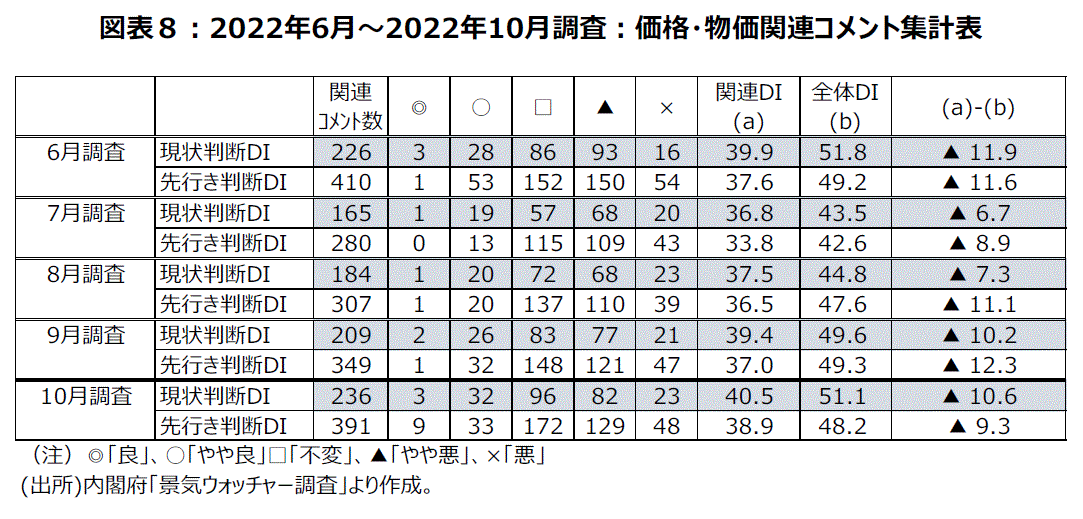 20年1月から盛り込まれてきた新型コロナウイルスに関する文言は22年5月に消え、6月~10月は登場していない。ワクチン接種の効果などで新型コロナウイルスの経済への影響力が比較的小さくなり、社会経済活動が正常化に向かいつつあることが背景にあろう。新型コロナウイルス現状DIをつくると、8月43.2、9月55.7、10月60.4であった。先行き判断DIは、7月42.5から、第7波が落ち着くとの判断から8月51.3、9月59.2と50超になったが、第8波が懸念されるようになった10月は53.9になった。一方、物価高による悪影響や米国景気など海外景気の悪影響など、相変わらず懸念材料は多い。10月の「価格or物価」現状判断DI40.5、先行き判断DI38.9。先行きコメント数391と多い(図表8)。厳しい数字といえる。