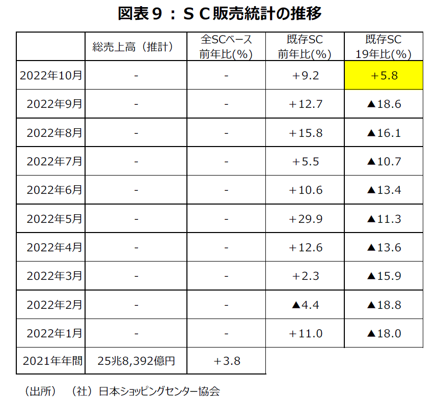 日本ショッピングセンター協会のSC販売統計調査報告で既存SC売上高の前年同月比は10月で+9.2%となった。新型コロナウイルス感染状況が落ち着いていたことや行政による行動制限がなかったことなどに加え、10月11日から始まった全国旅行支援により観光需要が高まったことがプラス要因だった。19年と比較すると+5.8%となり、コロナ禍以降で初めて2019年比プラスとなった(図表9)