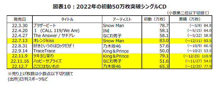 厳しい環境下でも景気拡張局面が継続していることを示唆する身近なデータのひとつに、音楽シングルCDで初動売上げ50万枚超が継続して出ていることが挙げられる。楽曲が格安価格でダウンロードできる時代、CDはファンが持っていたいから買う贅沢品になり、景気動向を敏感に反応する。経験上、目安は初動売上げ50万枚超かどうかだ。11月発売分の初動売上げでは、King&Princeの『ツキヨミ/彩り』が79.1万枚、なにわ男子の『ハッピーサプライズ』が51.6万枚だった。『ツキヨミ/彩り』は12月25日までの累計は110.9万枚とミリオンセラーになった。12月発売分の初動売上げでは、卒業を控える齋藤飛鳥にとってのラストシングルとして注目された12月7日発売の乃木坂46『ここにはないもの』が65.3万枚と50万枚超になった(図表10)。