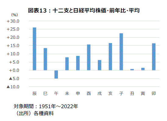 23年の国内景気は、悪材料を乗り越えて、緩やかながらも景気回復局面が継続する可能性が大きいだろう。「辰巳天井、午尻下がり、未辛抱、申酉騒ぐ、戌は笑い、亥固まる、子は繁栄、丑はつまずき、寅千里を走り、卯は跳ねる」という十二支と株価との関係を表す格言がある。1951年から2022年のデータで日経平均株価・前年比の平均をみると、丑年+0.8%と寅年+1.5%と低い伸び率だが、卯年は+16.4%で、辰年、子年、亥年に次いで4番目に高い伸び率の干支である(図表13)。23年の日本株には、民需の底堅さを反映する企業業績、急激な円安やエネルギー価格高騰一服といった日銀が金融緩和を継続しやすい環境などのプラス要因が働くとみられる。23年の卯年も、過去の平均並みの2ケタの上昇が期待される。