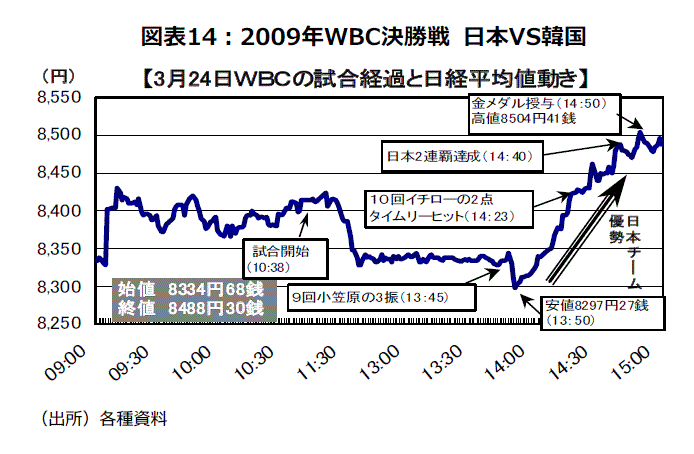 日本の初優勝した第1回の決勝戦は春分の日に当たった。2度目の優勝を果たしたWBC決勝「日韓戦」が行われた3月24日(現地は3月23日)は平日で、日経平均は後場の取引開始から午後1時45分ぐらいまでほとんど動かない時間帯があったが、10回のイチローの2点タイムリーヒットがあった14時23分には8,427円に上昇、金メダルが授与された14時50分には8,504円の高値をつけた。結局3月24日の終値は前日比272円高になった。日本が優勢になると引けにかけて日経平均が一段高になった(図表14)。決勝の「日韓戦」のテレビ視聴率(関東地区)は平日にもかかわらず36.4%を記録し空前の盛り上がりを見せた。