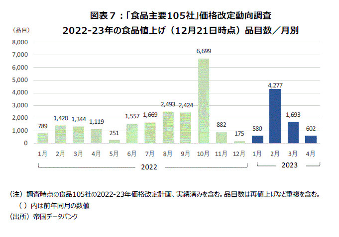 帝国データバンクの「食品主要105社」価格改定動向調査(12月21日時点)によると、22年10月は昨年では最多の6,699品目で値上げが行われた。11月は882品目で値上げが行われた。12月は175品目の予定だ。マスコミでは23年1月~4月の価格改定品目は多く、7,000を超えるとよく報道されているが、一番多い2月でも4,277品目で、22年10月がピークであることに変わりはない(図表7)。