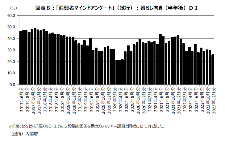 人々の生活への不安感は強まっている。内閣府の12月「消費者マインドアンケート調査」から、景気ウォッチャー調査と同様の手法で「物価上昇」DIをつくると88.5になる。3月以降10カ月連続で85以上の高水準が続いている。一方、「暮らし向き」DIは11月の29.6から12月は25.8まで低下した。25.0は全員が「やや悪くなる」と回答した水準だ。これより低い水準は新型コロナの影響で景況感が急激に悪化した20年3月~5月の3カ月しかない(図表8)。