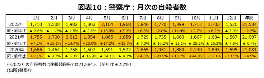 こうした動きが犯罪統計などの悪化傾向の背景とみられる。金融機関の店舗強盗事件は19年13件、20年11件、21年9件と近年は発生が少ない状況が続いてきた。しかし、22年は1~11月で17件となり、15年以来7年ぶりの前年比増加が確定している。また、刑法犯総数の認知件数は近年減少傾向で、昨年は56.8万件と前年比▲7.5%の減少だった。しかし、22年1~11月の前年比は+5.5%で、11月単月だと+12.0%と足元は増加傾向に変わった。自殺者数の前年同月比は21年7月~22年4月まで10カ月連続して減少だったが、12月速報値段階で、22年5月~11月では7カ月連続増加になった。12月速報値は▲3.0%と8カ月ぶりの減少になったが、22年年間では前年比+2.7%と、20年以来の2年ぶりの増加になった(図表10)。