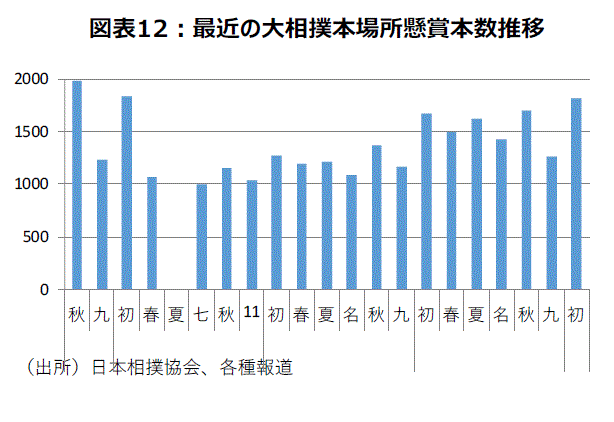 大相撲初場所の懸賞本数は1,817本、前年同場所比+8.4%と10場所連続で増加となった。コロナ禍で最高水準を更新し、コロナの影響がほぼなかった令和2年の初場所の1,835本にあと一歩と迫った(図表12)。企業の業績・広告費の底堅さが感じられる数字と言えよう。令和5年初場所は、横綱が休場している照ノ富士1人・大関が貴景勝1人という異例の番付で明治31年(1898年)春場所以来125年ぶりのことだった。