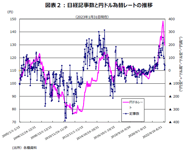 FRBの利上げペース鈍化で、昨秋には一時150円/ドル台前半になったドル円レートが130円/ドル前後まで戻った。ドル円レートの先行指標である日経記事数・円安超数は22年10月後半に257でピークをつけ1月前半の9まで低下、ドル円レートに見合った動きになった。なお、1月後半には円安超の記事数は41まで戻した(図表2)。目先、一方的に円高が進むことはなさそうで130円/ドル中心のボックス圏推移が予測される。