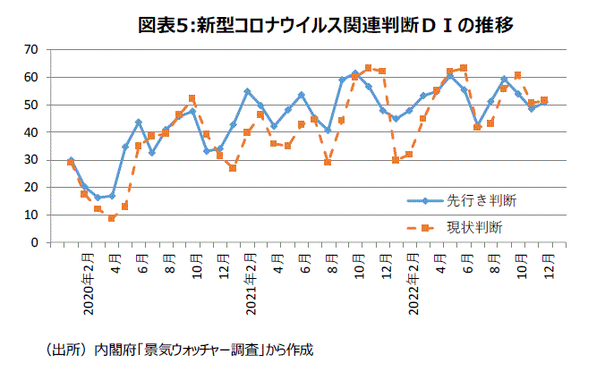 「景気ウォッチャー調査」では「新型コロナウイルス」という言葉が20年1月調査で初めて登場した。それ以降、新型コロナウイルスの感染拡大の影響が景況感の大きなマイナス材料となっていたが、最近ではプラス要因として働くようになった。ワクチン接種がそれなりに進み、新型コロナウイルスの感染が拡大している時期でも行動制限がとられなくなったからだ。毎月コメントするウォッチャーのコメント数は1,800件前後だが、これまでの「新型コロナウイルス」のコメント数・最多は、現状判断998件、先行き判断1,085人と過半数超えで、どちらも20年3月に記録した。22年での最多は、現状判断・先行き判断とも1月で、各々724件、929件だった。第8波で感染者数が増えてきていた22年12月では、現状判断278件、先行き判断361件にとどまった。新型コロナウイルス関連・現状判断DIは直近の9月から12月までは4カ月連続で50超となった(図表5)。新型コロナウイルスが景況感の足を引っ張らなくなったことを示唆している。