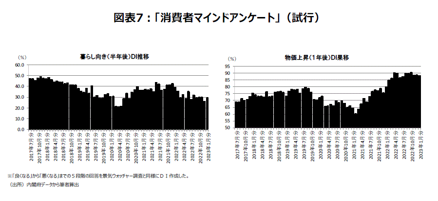 内閣府の「消費者マインドアンケート調査」にも消費者心理の悪化が表れている。景気ウォッチャー調査のように5段階の回答を0.25刻みで加重平均し、DIを作成すると、ここにきて半年後の暮らし向きが悪化するとみる見方が増え、1年後の物価上昇を予想する人も高水準で高止まりしている。「物価は上がり、暮らし向きは悪くなる」と思っている人が多い(図表7)。