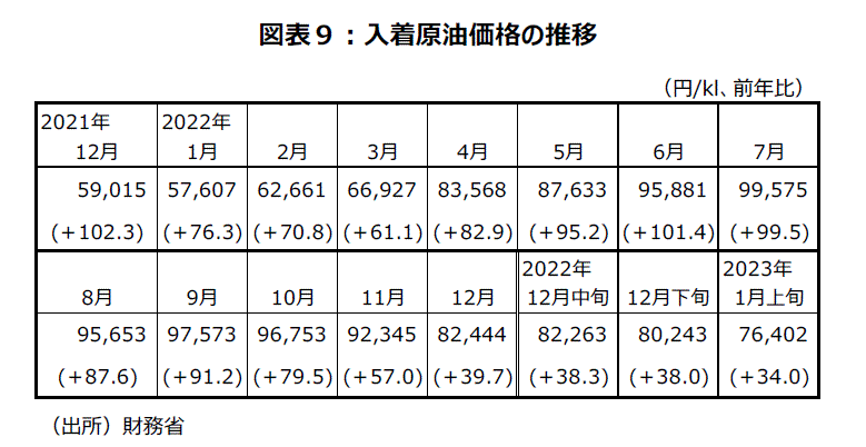 せっかく入着原油価格が22年7月の99,575円/㎘(前年同月比+99.5)から23年1月上旬の76,402円/㎘(前年同月比+34.0)へと半年で鈍化してきている(図表9)ものの、ガソリン価格は、価格を一定に保つためとして、補助金を減額し、消費者は価格低下を感じられないばかりか、12月の国内企業物価指数で石油石炭製品の前月比+2.6%上昇の主要因になり、物価高止まりの印象を与えてしまっている。今後は、4月に控える「輸入小麦」の価格改定動向が注目される。小麦の国際相場はピークから下落しているが、21年に比べると高止まりの状態が続いており、改定幅次第では値上げの動きが比較的沈静化しているパンなどの製品価格に波及する可能性がある。政府が予備費などを活用するなど、しっかりと物価対策の視点から価格改定を行うかどうか要注視だ。
